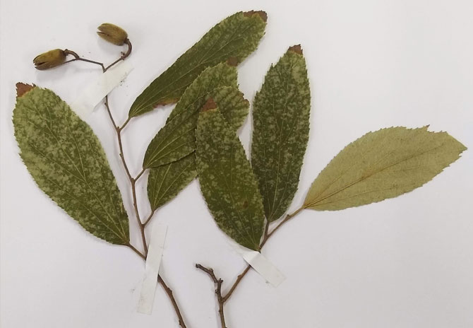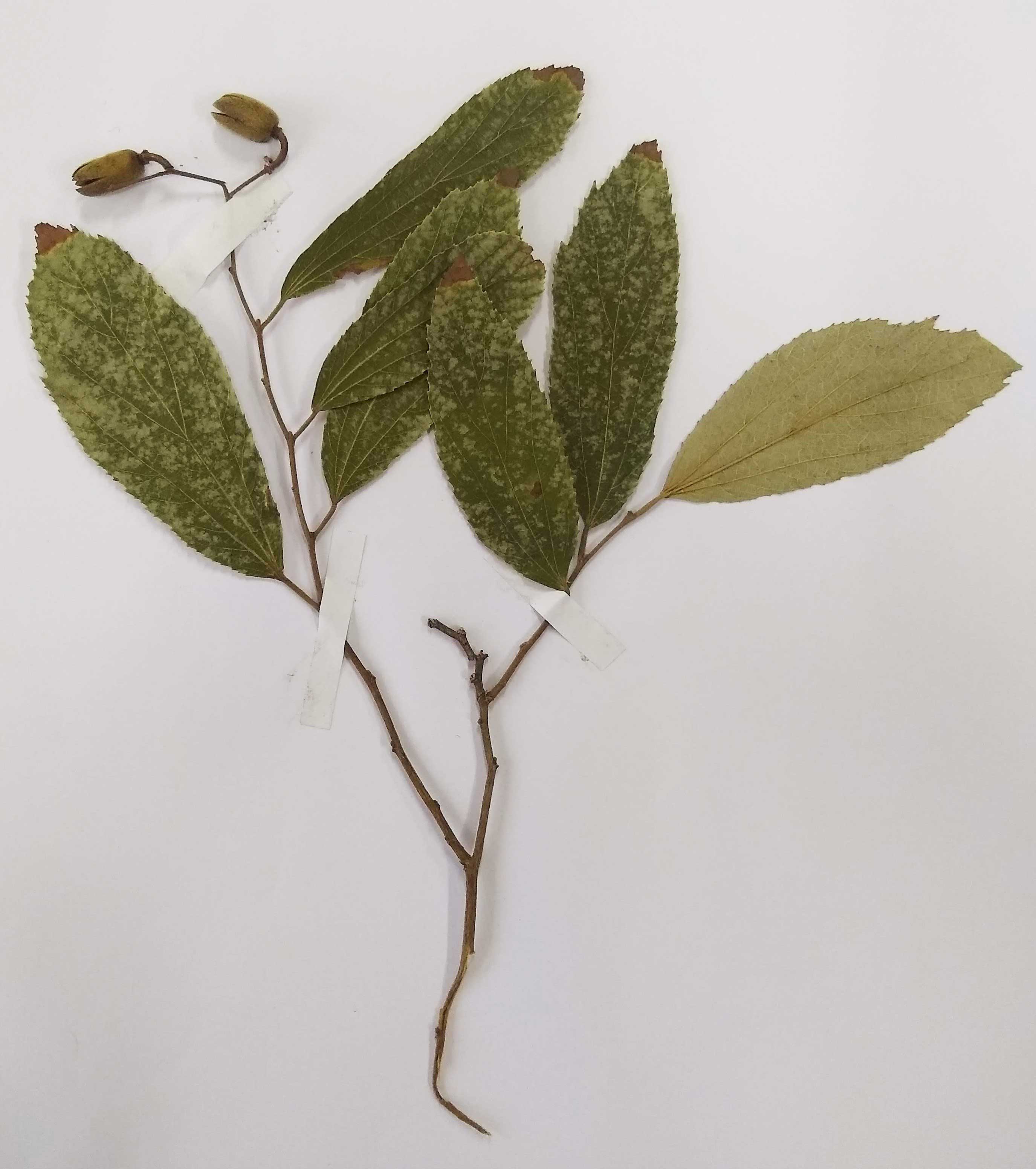 Hojas: simples, alternas, abovadas a ovales, de 13 cm largo por 5 cm de ancho, borde irregularmente dentado, pelos aislados en cara superior y muy pubescente en la inferior (discolor). Caducas. Fruto cápsula ovoide, leñosa y dehiscente por el ápice, de 3 cm de longitud.