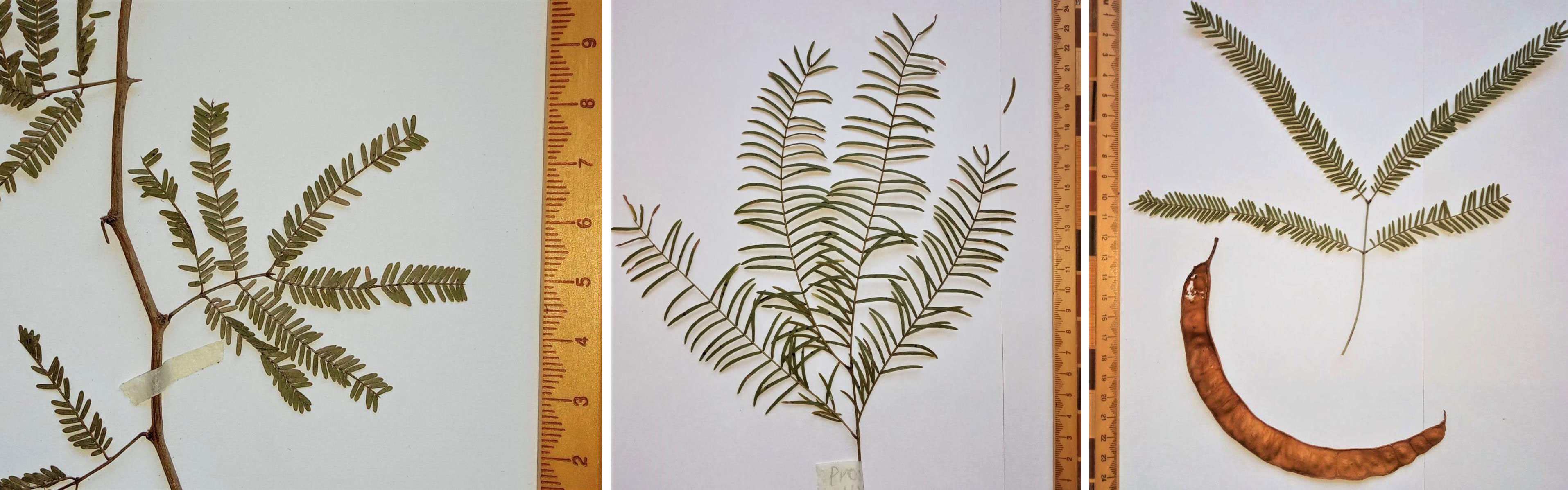 Algarrobo 6 | Izquierda Prosopis caldenia “caldén”. Hojas compuestas, bi-paripinadas, con 3 pares de pinas, 20-36 pares de folíolos de 5-8 mm largo, de borde entero. | Centro Prosopis flexuosa hojas bi-paripinadas, con 2 pares de pinas, 20-30 pares de folíolos de 15-25 mm largo, con una separación mayor a 3 mm entre folíolos. | Derecha Prosopis alba hojas bi-paripinadas, con 2 pares de pinas, 30-60 pares de folíolos de 7-15 mm largo, de borde entero. Fruto legumbre indehiscente, semileñosa, amarilla, curva.