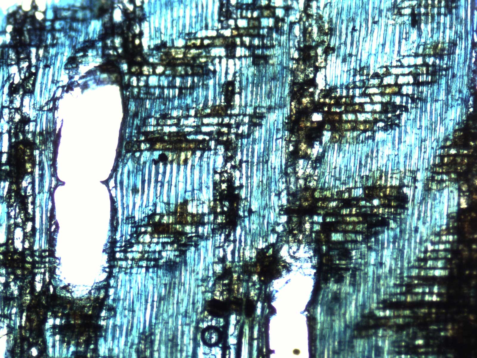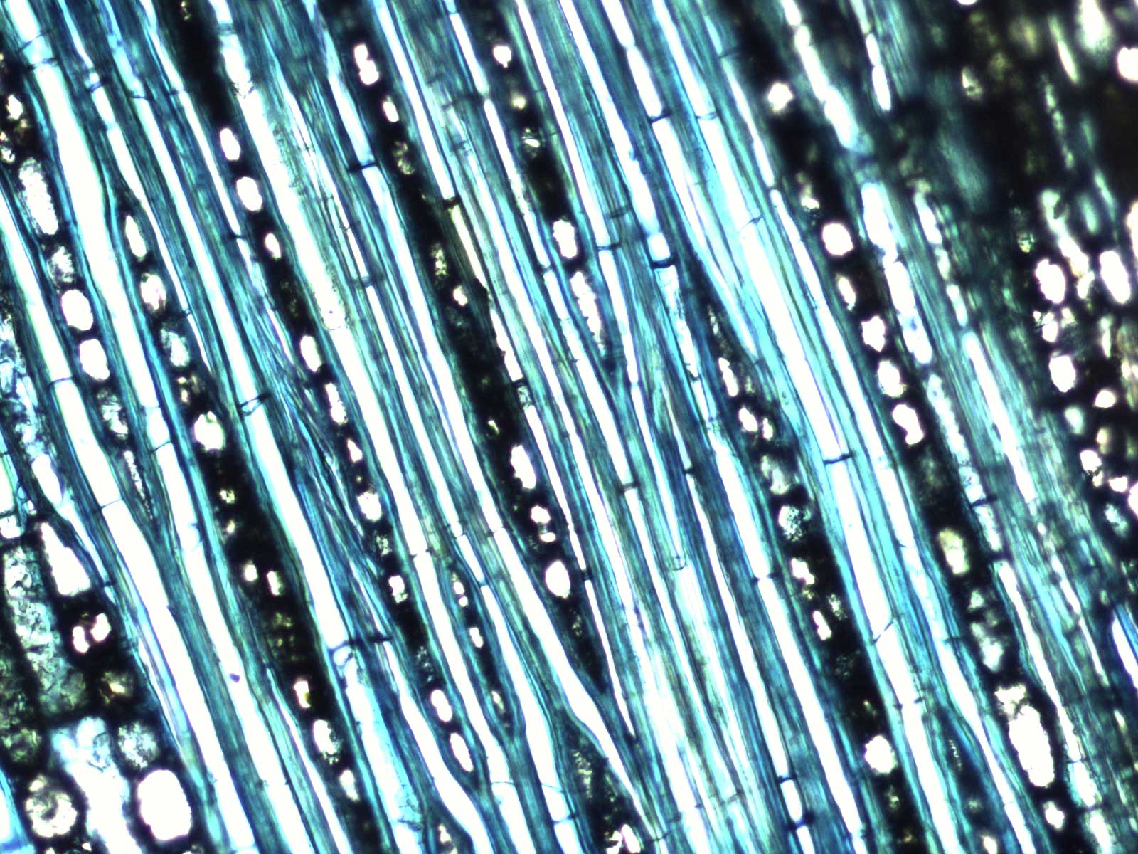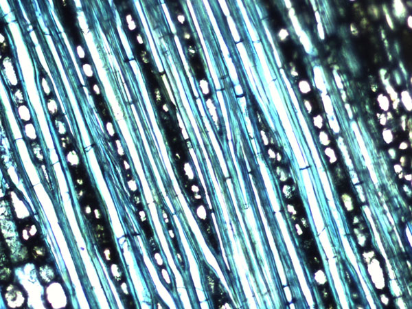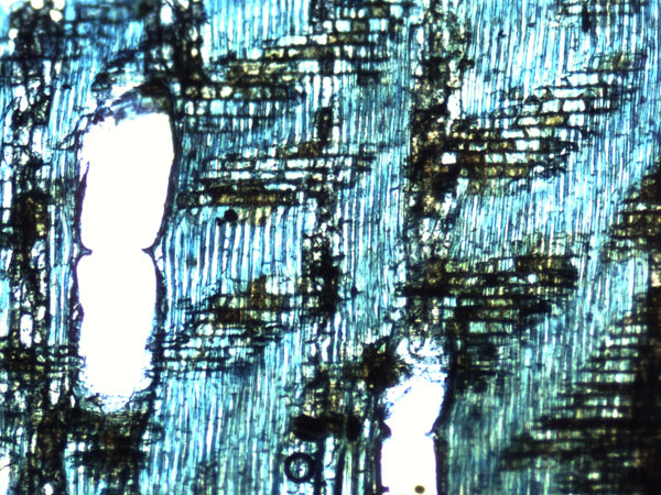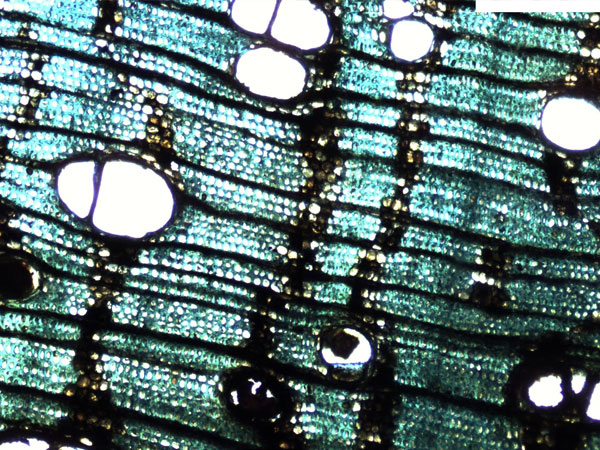 Anillos de crecimiento no demarcados, con porosidad difusa, poros solitarios y múltiples, sin disposición especial, vasos sin contenidos, con placas de perforación simples. Parénquima axial confluente y en bandas angostas. Las series parénquimáticas son de 4-8 células. Radios leñosos de 1-seriados, a veces 2-seriados y, en menor proporción, 3-seriados, heterogéneos. Sin estructura estratificada. Fibras de paredes medianas, de tipo septadas.
