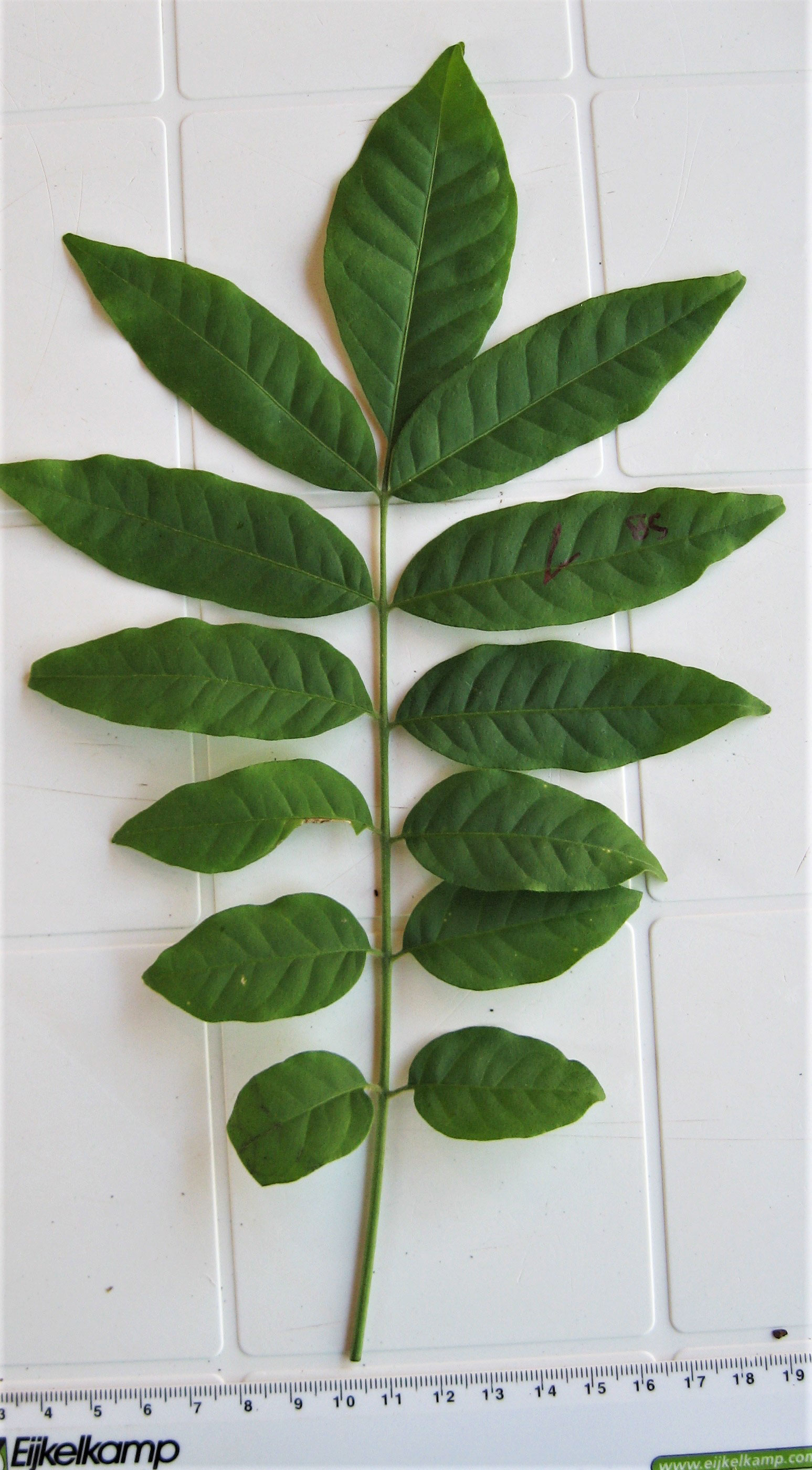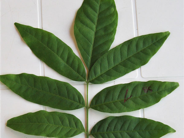 Hojas compuestas, alternas, imparipinadas, con 6-12 pares de folíolos opuestos, sésiles o subsésiles, aovado-lanceolados, de ápice agudo a acuminado, de 7-11 cm largo por 1,3-5 cm ancho, glabros. Fruto capsulas globosas de 2,5-3 cm, con 5 surcos longitudinales.