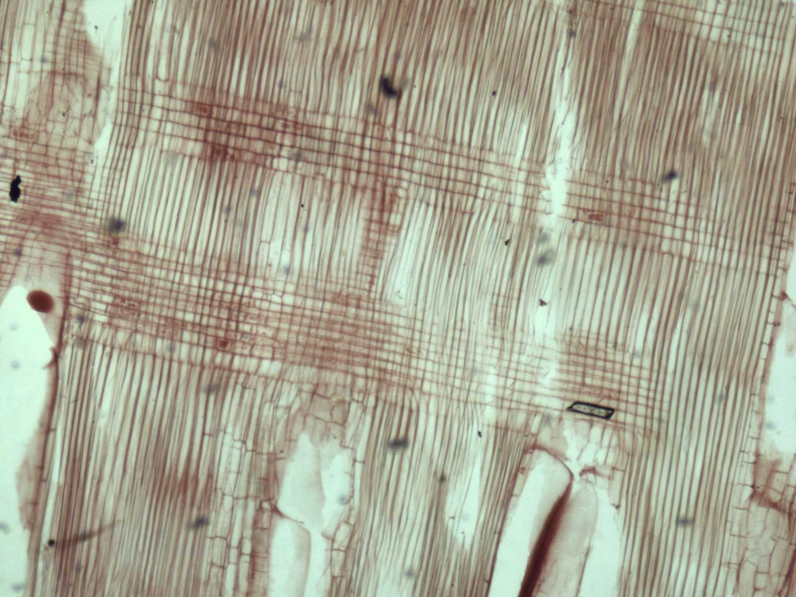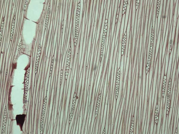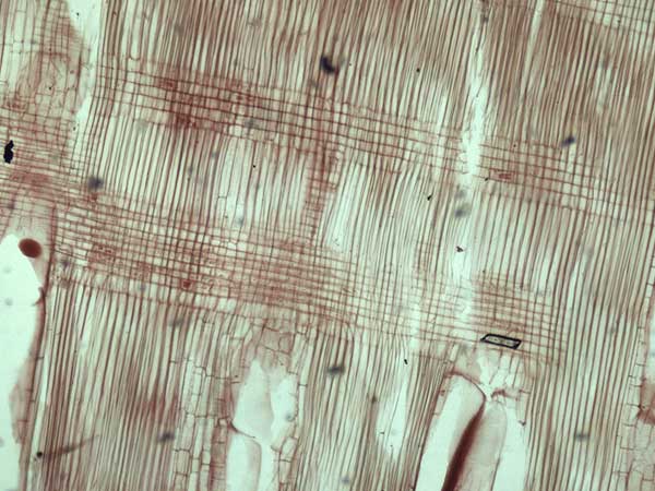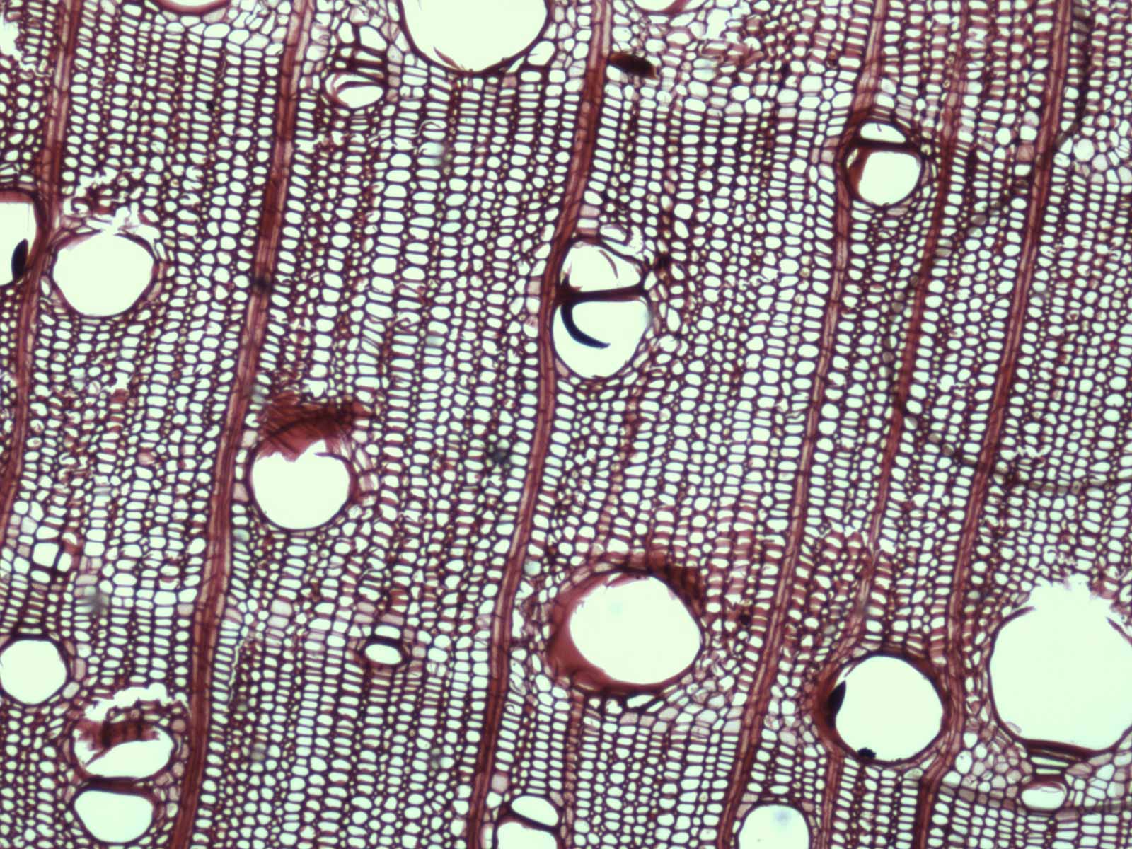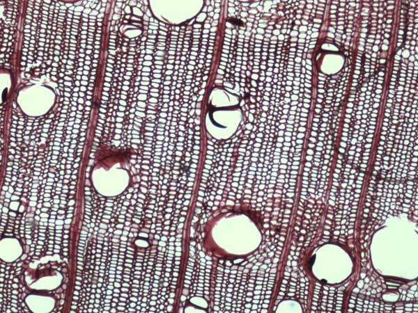 Anillos de crecimiento demarcados por la porosidad y por el parénquima marginal. Porosidad circular/semicircular a difusa, poros medianos a grandes, solitarios y 2-3 seriados, sin disposición especial, vasos con contenidos, con placas de perforación simples. Parénquima axial vasicéntrico, apotraqueal difuso y marginal. Las series parénquimáticas son de 4-8 células. Radios leñosos 1-3 seriados, a veces multiseriados, heterogéneos. Sin estructura estratificada. Fibras de paredes finas o medianas, de tipo libriformes. Cristales en parénquima axial y radios.