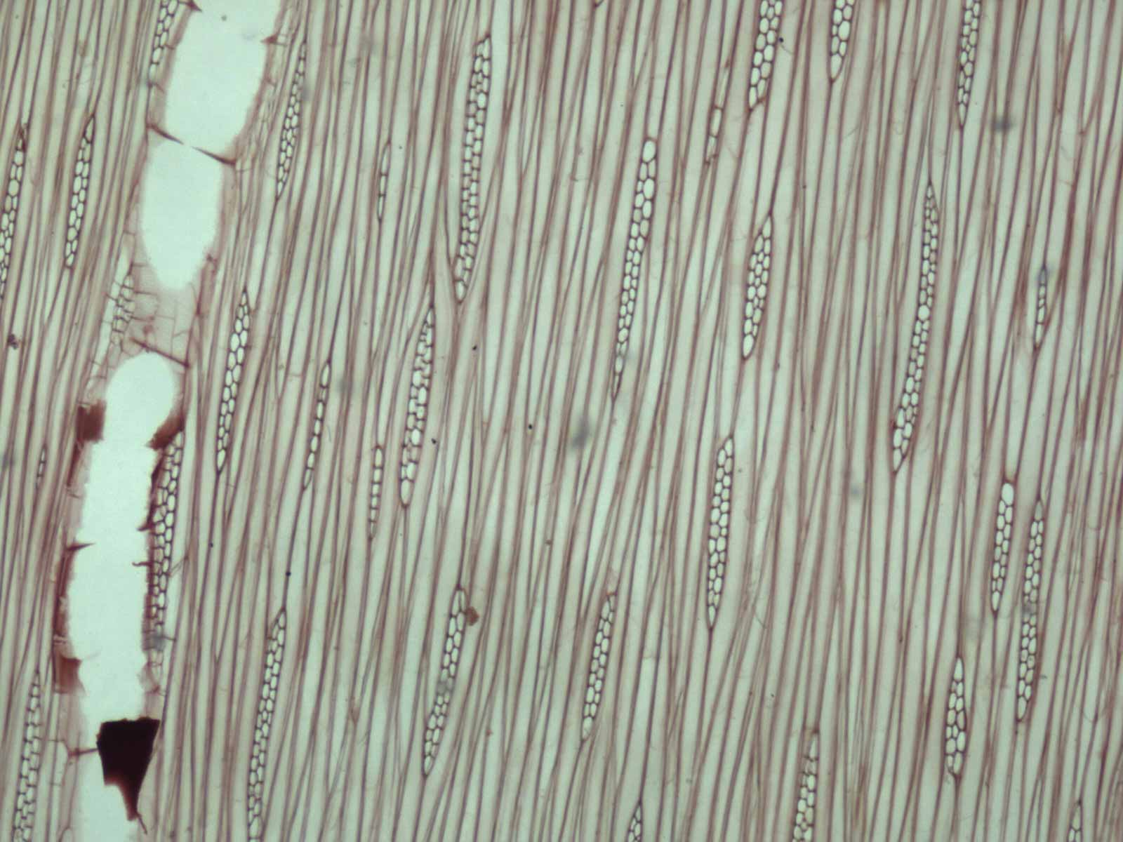 Con anillos de crecimiento demarcados por líneas blancas de parénquima marginal. Porosidad semicircular a difusa, poros medianos a grandes, generalmente solitarios, sin disposición especial, vasos con contenidos. Parénquima axial vasicéntrico y marginal.