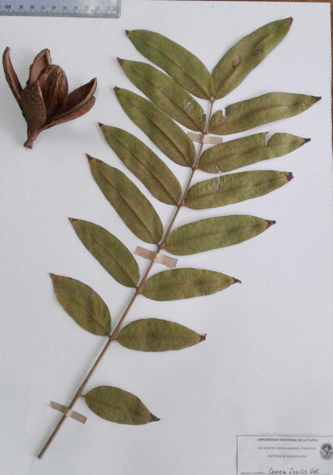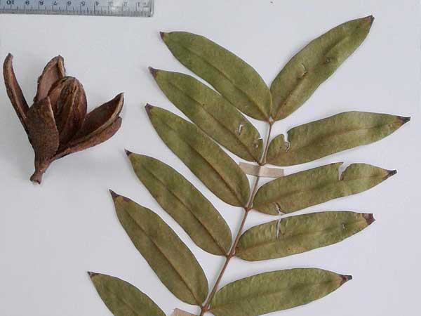 Hojas compuestas grandes (40-60 cm largo), alternas, pinadas, con 12-15 pares de folíolos opuestos, sésiles o subsésiles, aovado-lanceolados, de ápice agudo a acuminado, de 9-13 cm largo por 3-5 cm ancho, glabros en la cara superior y pubescentes en la inferior. Fruto cápsula piriforme, leñosa, dehiscente, pardo-verdoso con lenticelas claras, de 6-10 cm largo, con un eje central y 5 valvas que se abren como una flor.