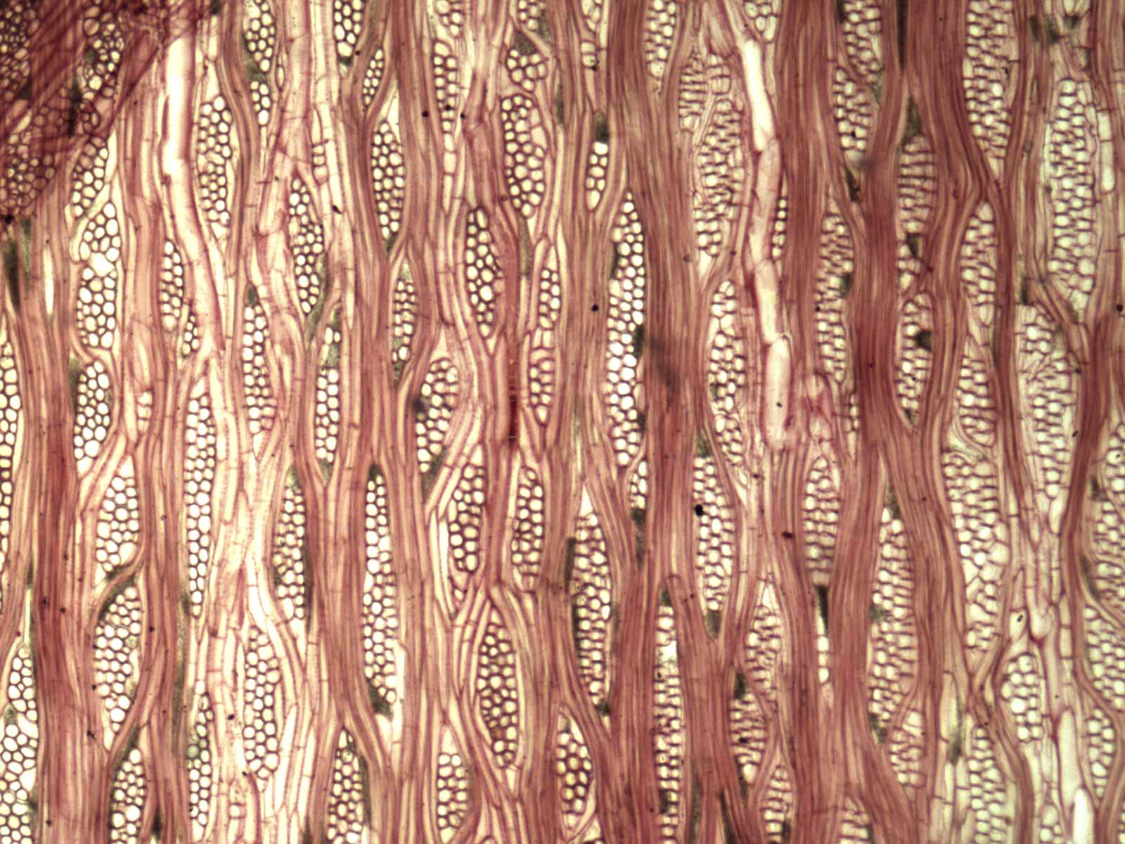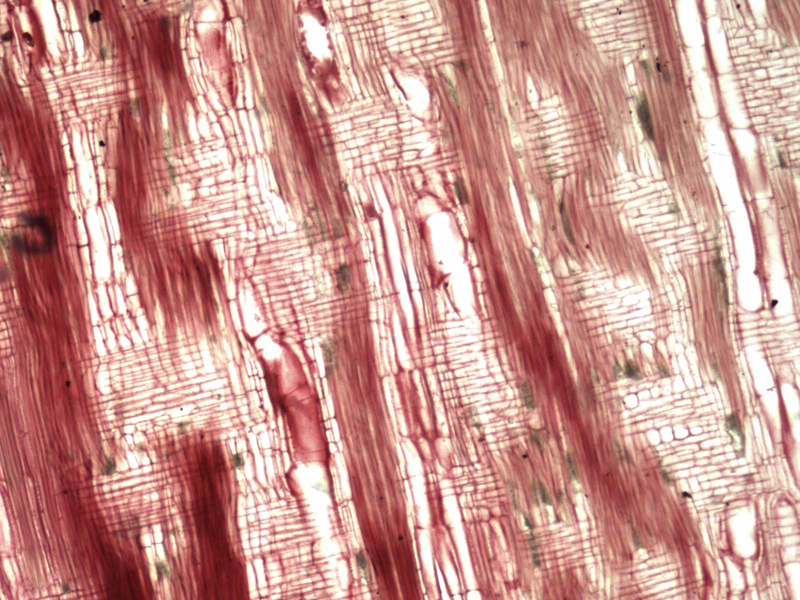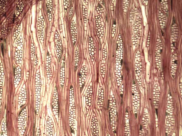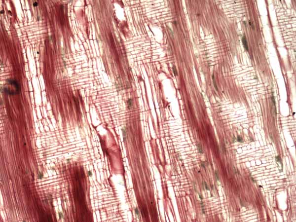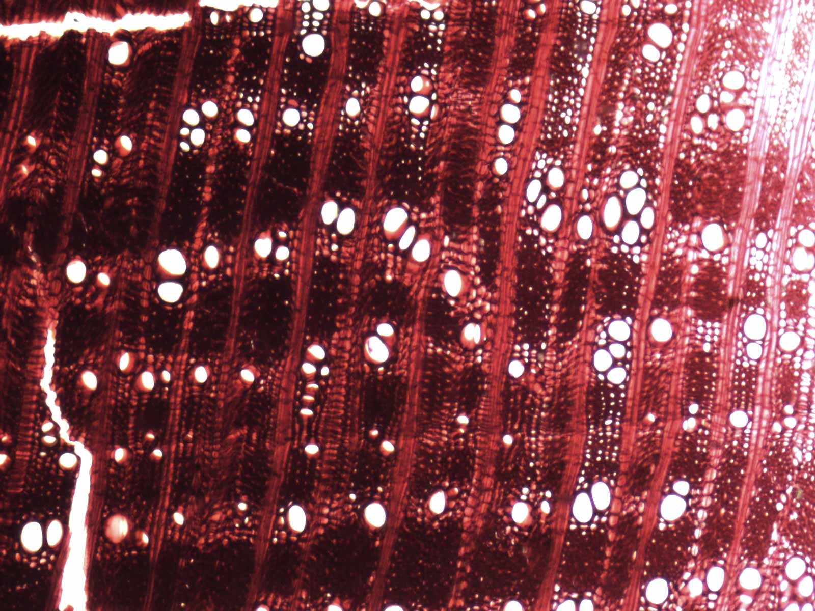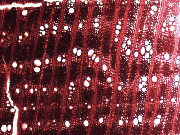 Los anillos de crecimiento son poco demarcados. Porosidad difusa, poros solitarios y múltiples o agrupados, sin disposición especial, vacíos. Parénquima axial vasicéntrico escaso y confluente, a veces en bandas angostas.