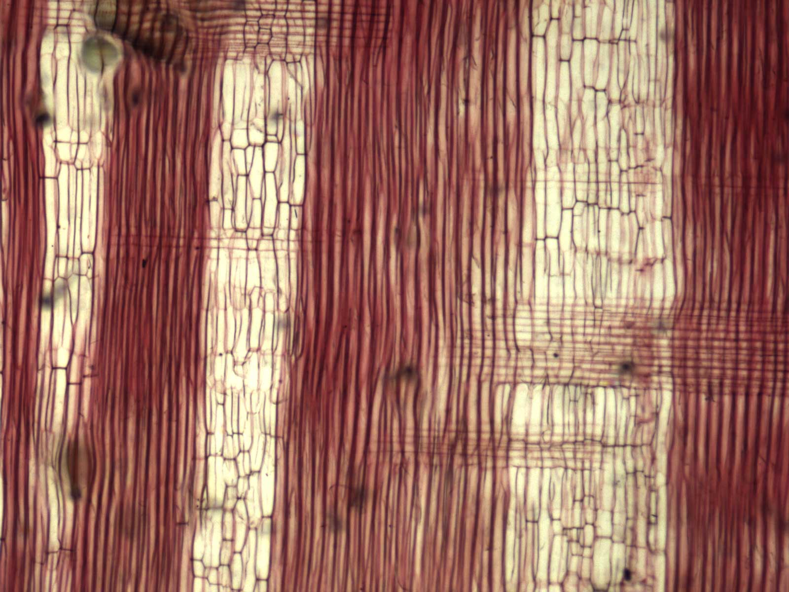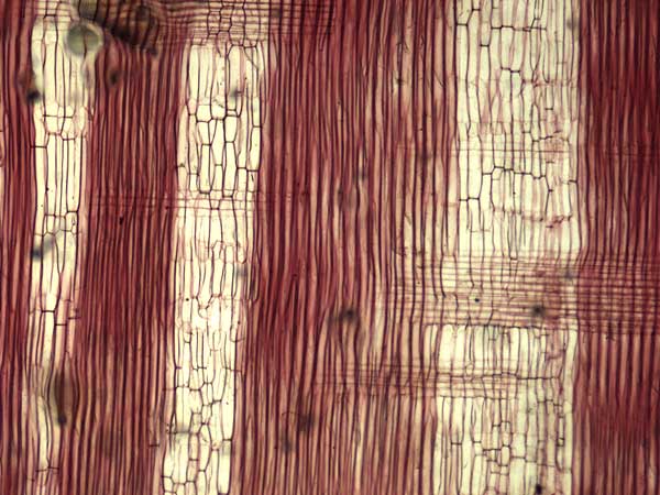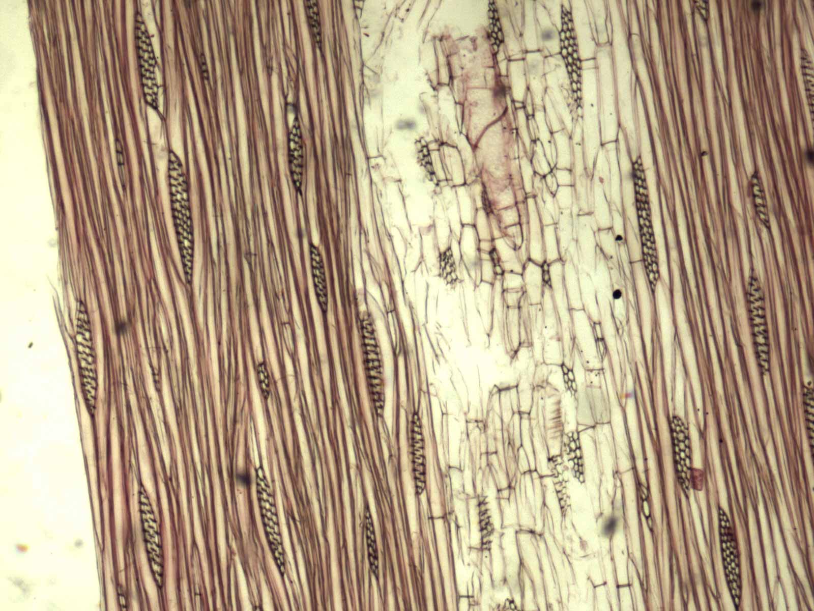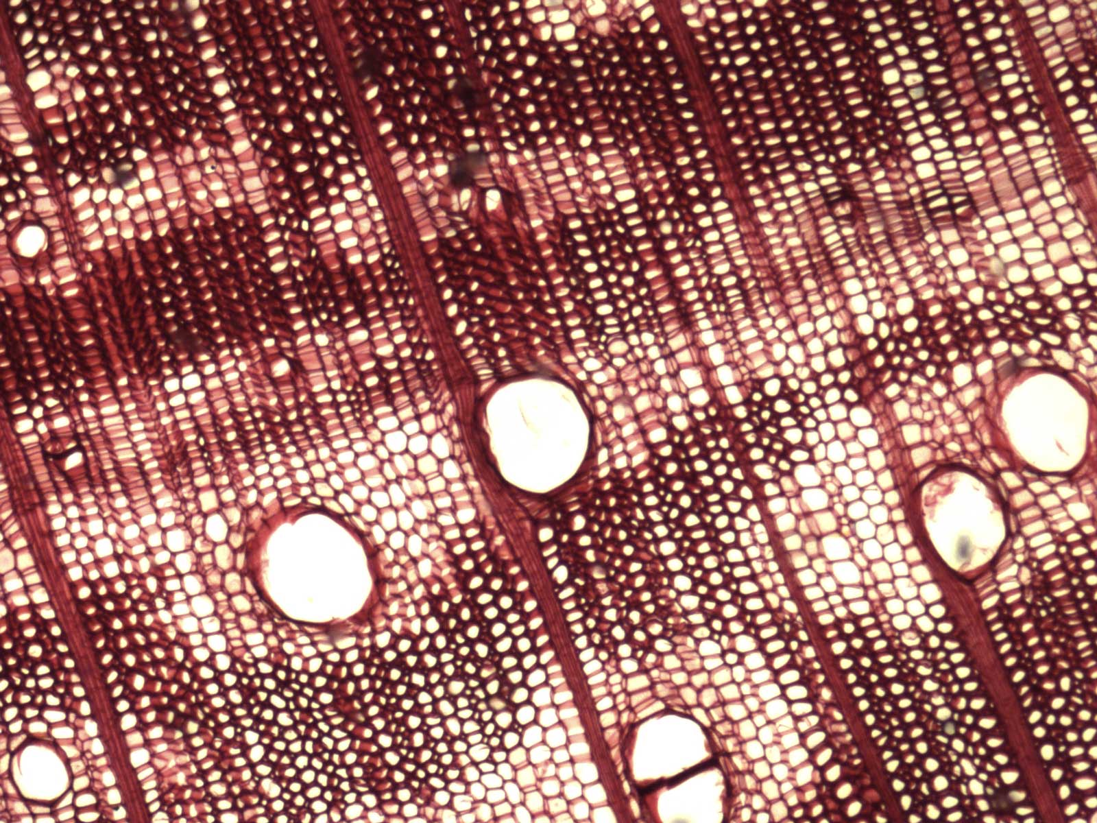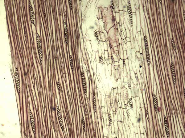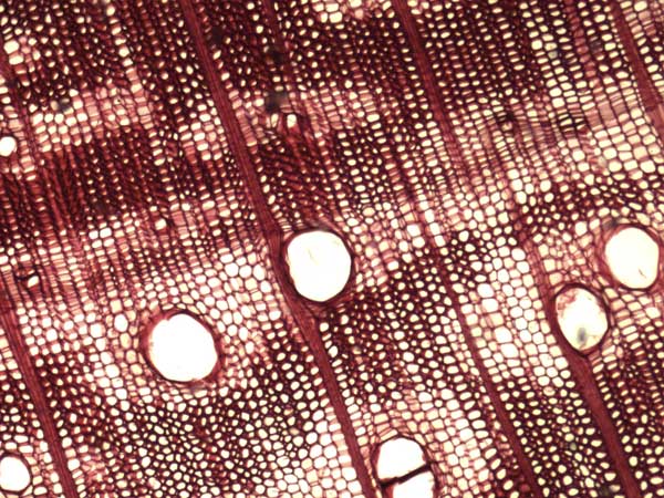 Anillos de crecimiento demarcados. Porosidad circular, poros solitarios y múltiples sin disposición, con contenidos en los vasos (tílides). Parénquima axial vasicéntrico abundante, confluente, en bandas y marginal. Radios 2-3-seriados, en menor proporción 1 y multiseriados, homogéneos. Estructura estratificada ausente. Fibras libriformes.