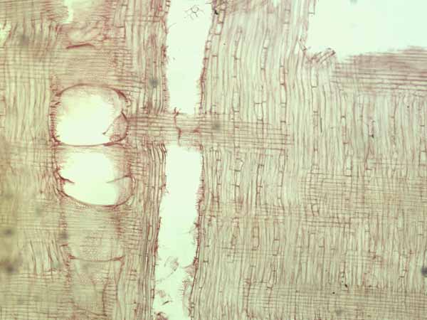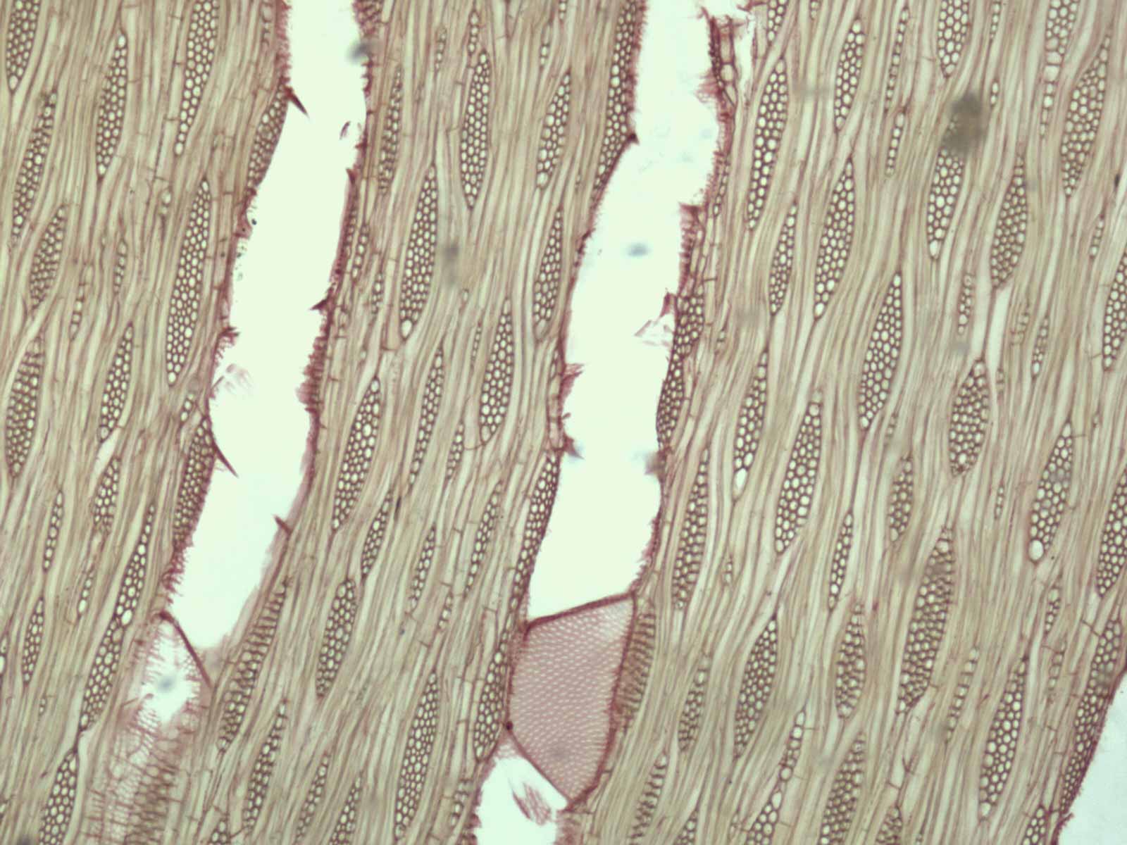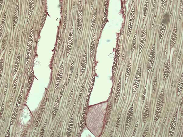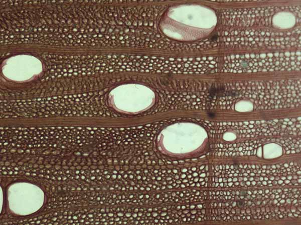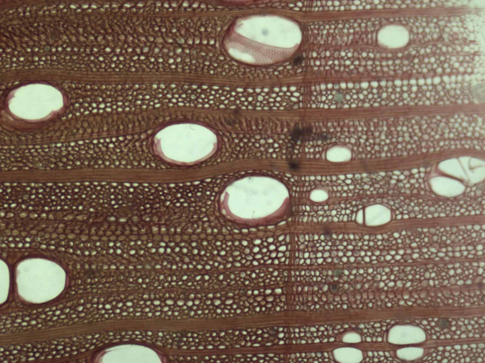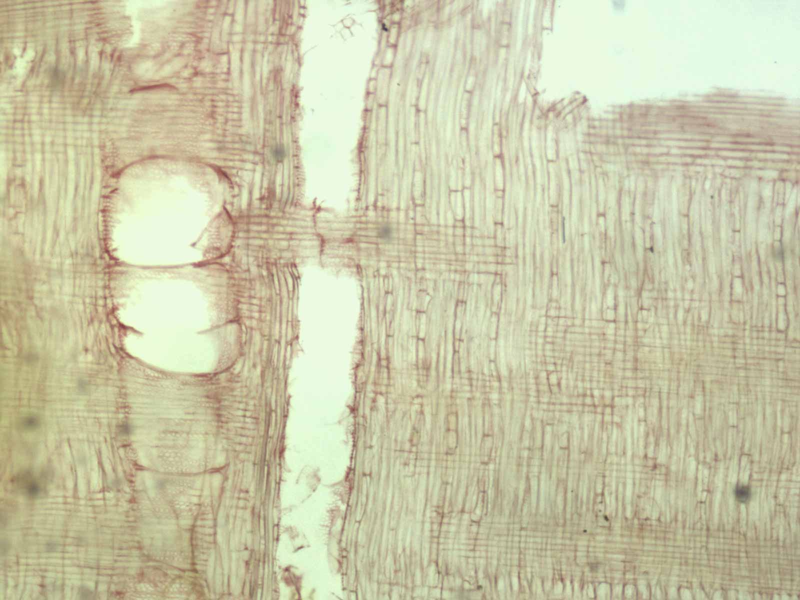 Anillos de crecimiento demarcados por la porosidad y el achatamiento de fibras. Porosidad semicircular o difusa, poros solitarios, 2-3 seriados y agrupados, sin disposición especial, vasos con tilides, con placas de perforación simples. Parénquima axial difuso agregado y reticulado, en series de 4-8 células. Radios leñosos multiseriados (2- 4seriados) y escasos uniseriados, heterogéneos. Sin estructura estratificada. Fibras de paredes medianas, de tipo libriformes. Cristales en radios.