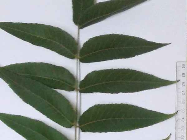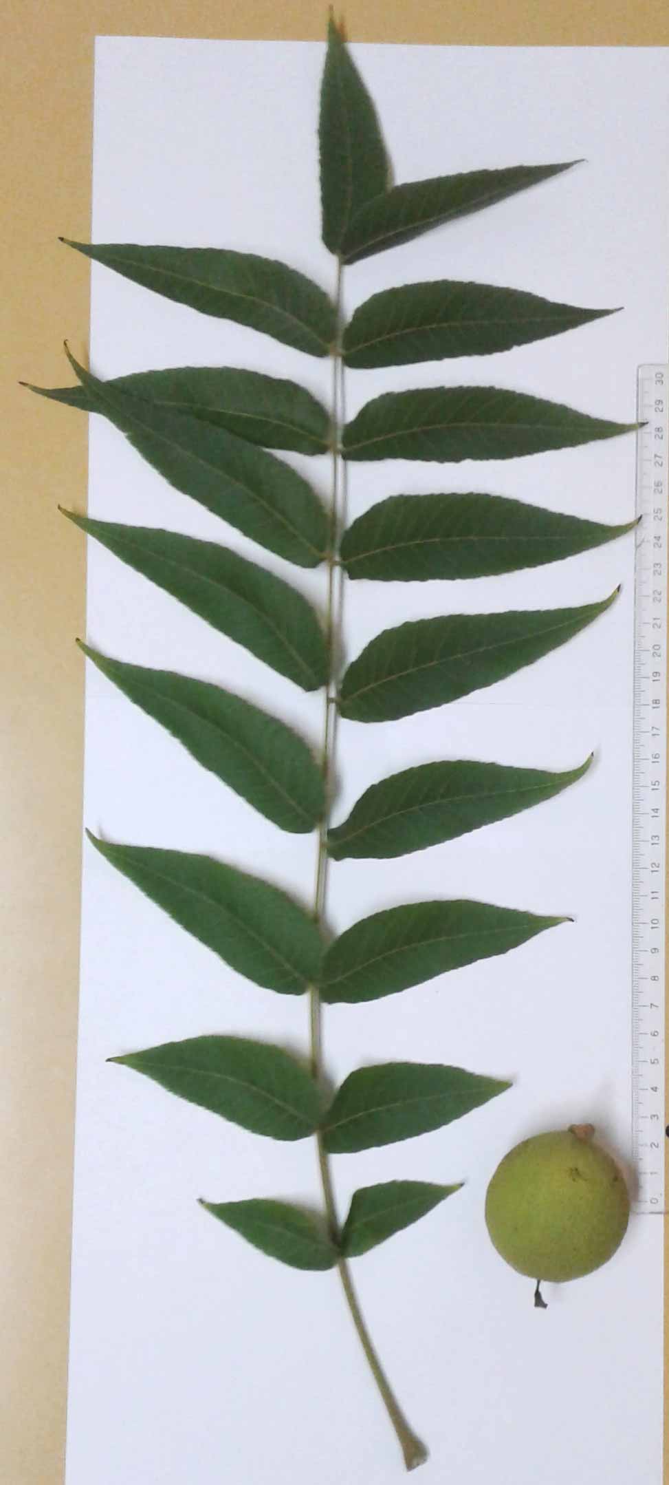 Hojas compuestas grandes (25-50 cm largo), alternas, imparipinadas, con 7-15 pares de folíolos opuestos, sésiles o subsésiles, elíptico-lanceolados, de ápice agudo a acuminado, margen aserrado, de 5-15 cm largo por 1,5-4,5 cm ancho, glabros en la cara superior y pubescentes en la inferior. Fruto drupa globosa 3-4 cm diámetro.