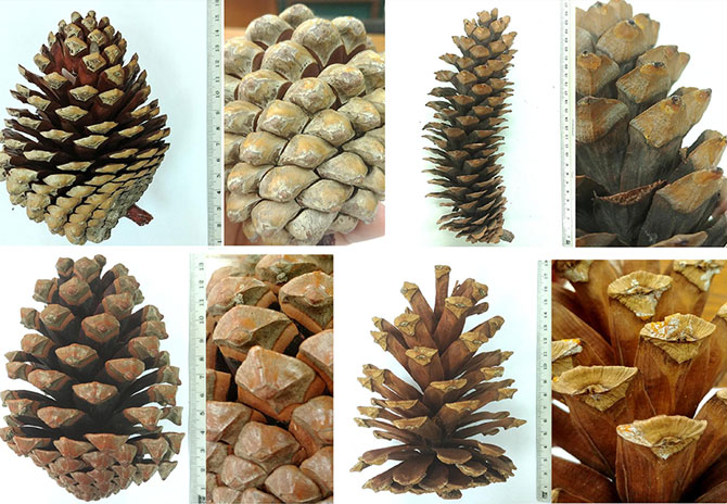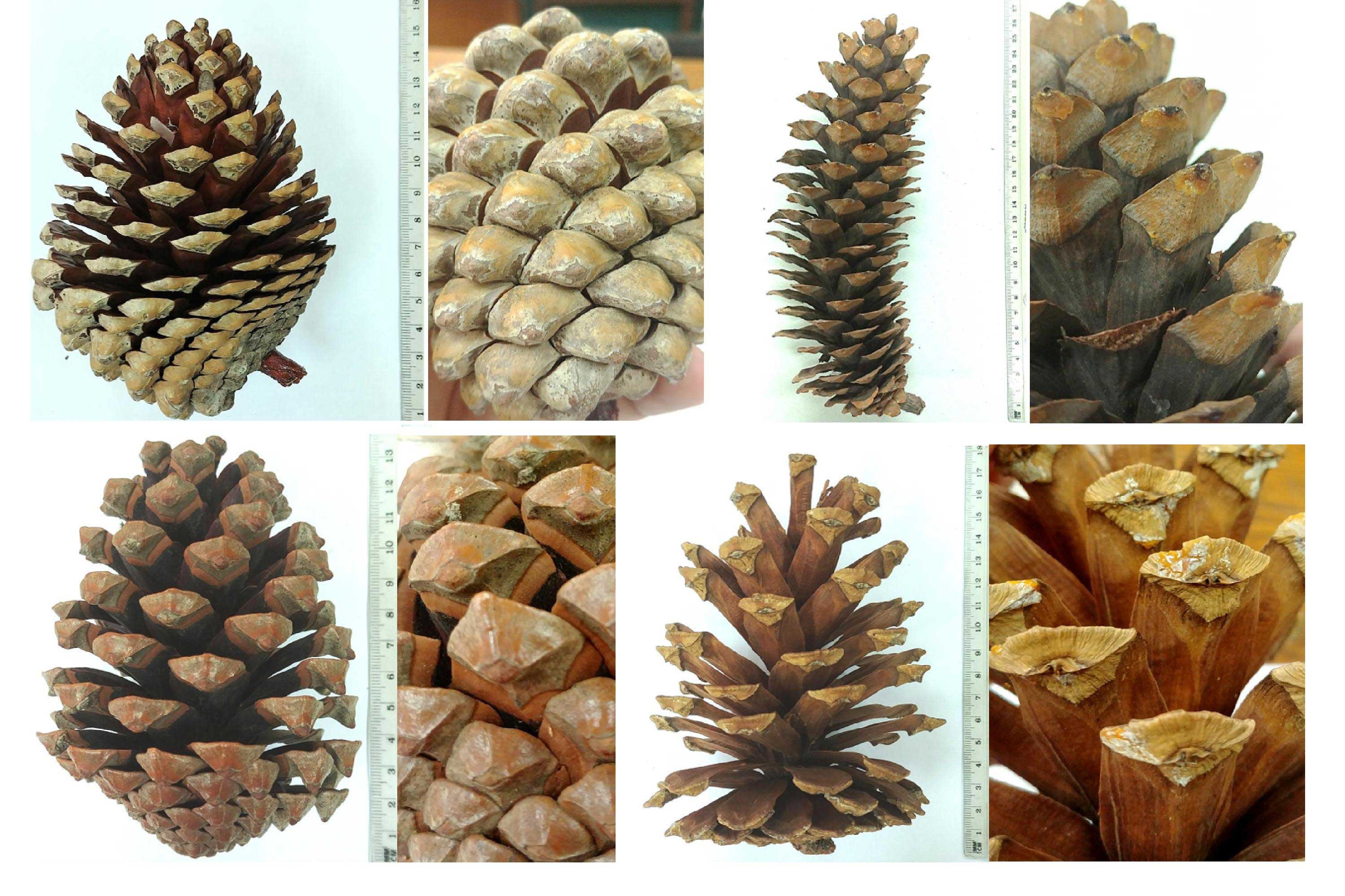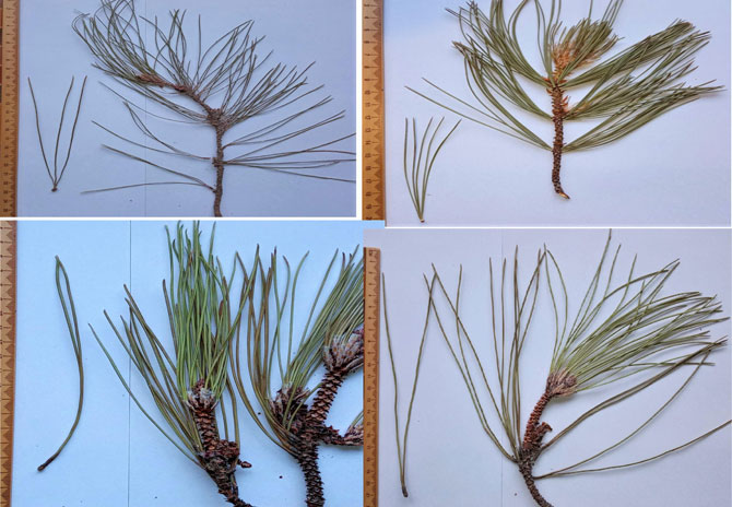 Pinus radiata (pino insigne, pino de Monterrey, pino de California) Hojas aciculares de 10-20 cm largo y reunidas 3 por braquiblasto, rectas a ligeramente retorcidas, verde claro brillantes, ápice agudo, borde finamente aserrado, de sección romboidal. Estróbilo femenino de forma ovoides de 7-14 cm largo, leñoso, pedunculado, muy asimétrico, reunidos en grupos apretados verticilados. Escama ovulífera con apófisis simétrica globosa, carena poco marcada y no aquillada, umbo central, sin mucrón