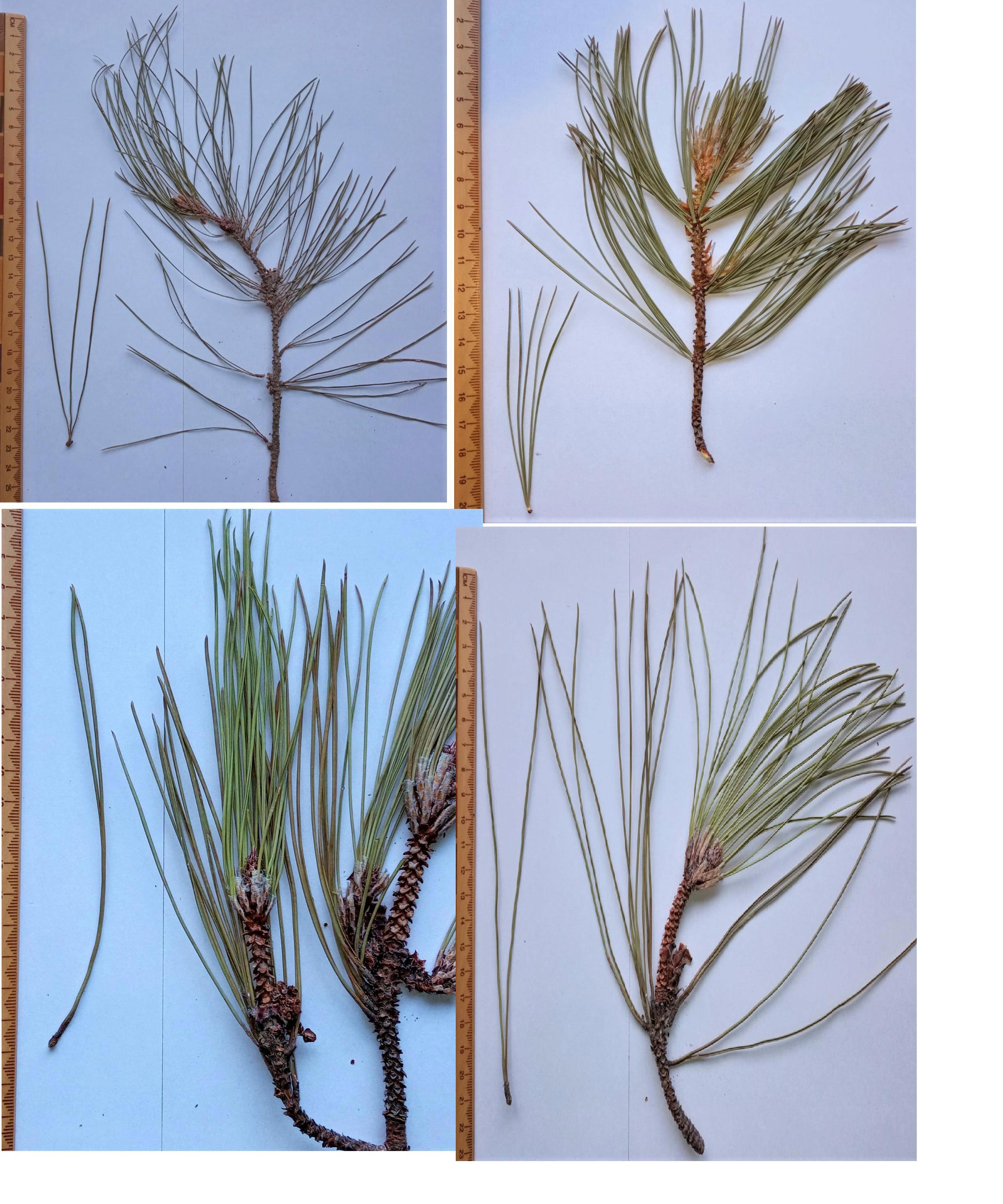 Pinus pinaster (Pino resinoso, Pino marítimo) Hojas aciculares gruesas de 12-22 cm largo y reunidas en 2 por braquiblasto, rígidas, verde brillantes, de sección variable. Estróbilo femenino de forma cónica, de 10-20cm largo, leñoso, pedunculado, simétrico. Escama ovulífera con apófisis piramidal, simétrica y prominente, carena muy marcada levemente aquillada, umbo central elevado, mucrón no espinescente.