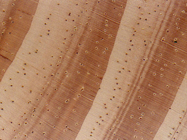 Pinus strobus (“pino blando”). Anillos de crecimiento claramente demarcados, transición gradual entre leño temprano y tardío, canales resiníferos presentes y abundantes. Traqueidas axiales con punteaduras areoladas uniseriadas, a veces biseriadas. Sin parénquima axial. Radios uniseriados y fusiformes con canales resiníferos radiales, radios heterocelulares con traqueidas radiales de paredes lisas. Campos de cruzamiento 1-2 fenestriformes.