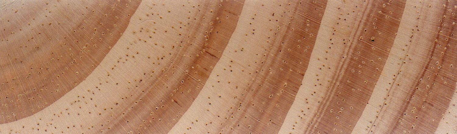 Anillos de crecimiento claramente demarcados, transición gradual entre leño temprano y tardío, canales resiníferos presentes y abundantes.