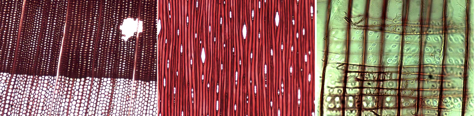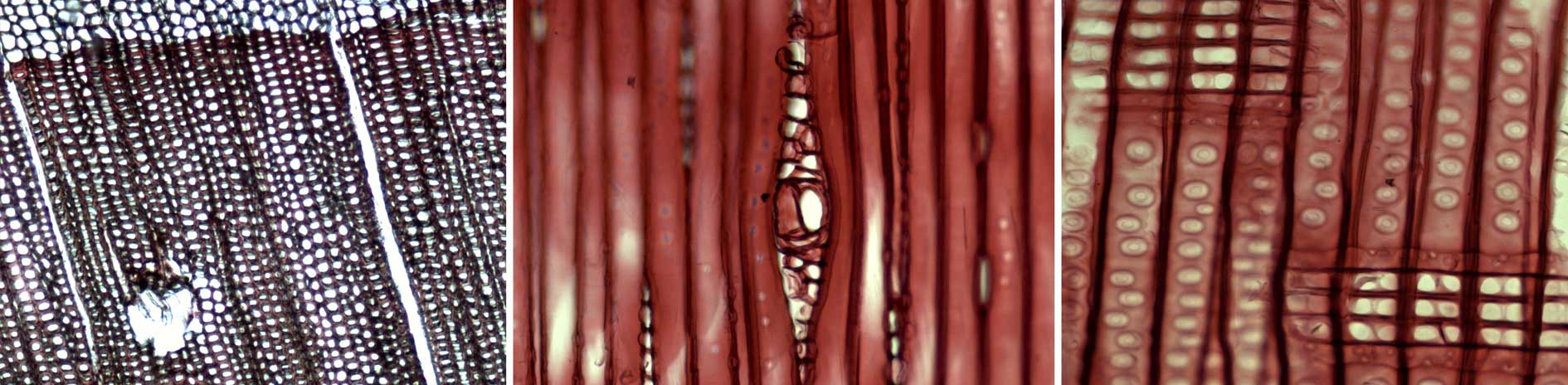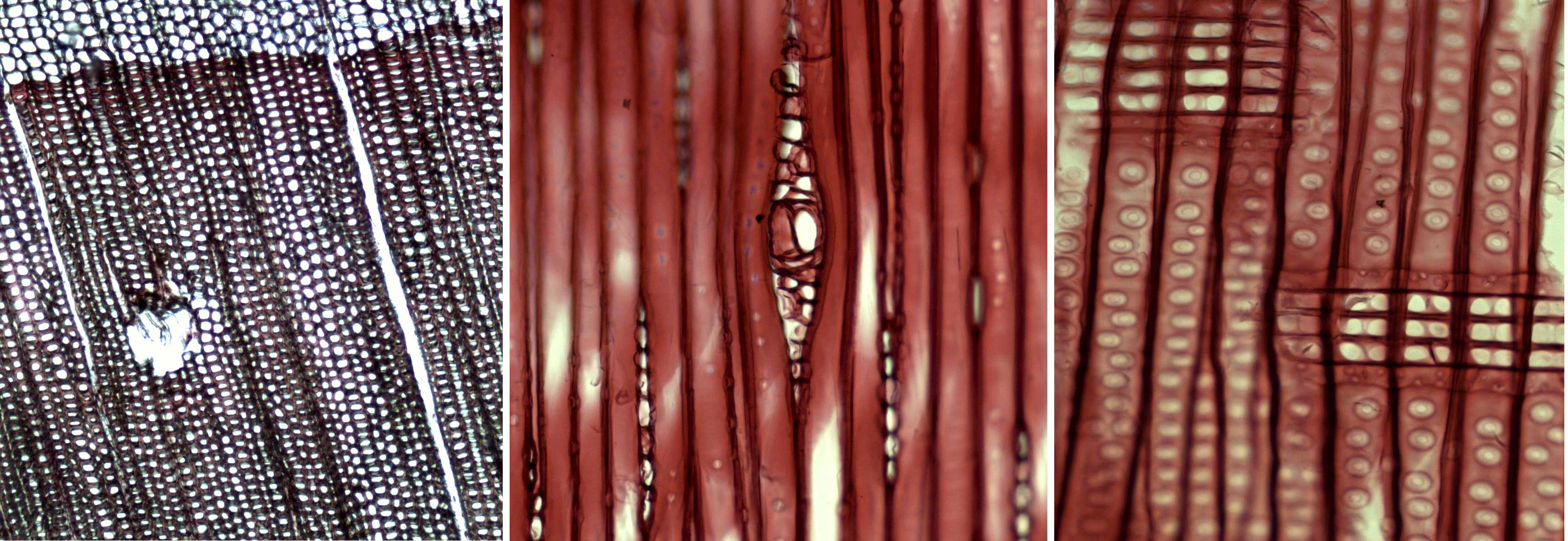 Pino taeda 4 |Pinus taeda. (3 secciones). Izquierda a derecha: CT (4x) Anillos de crecimiento claramente demarcados, canales resiníferos axiales presentes, CLtg (4x) Radios uniseriados y fusiformes con canales resiníferos radiales, CLrd (10x). Radios heterocelulares con traqueidas radiales marginales de paredes dentadas. Campos de cruzamiento 4-6 pinoides.
