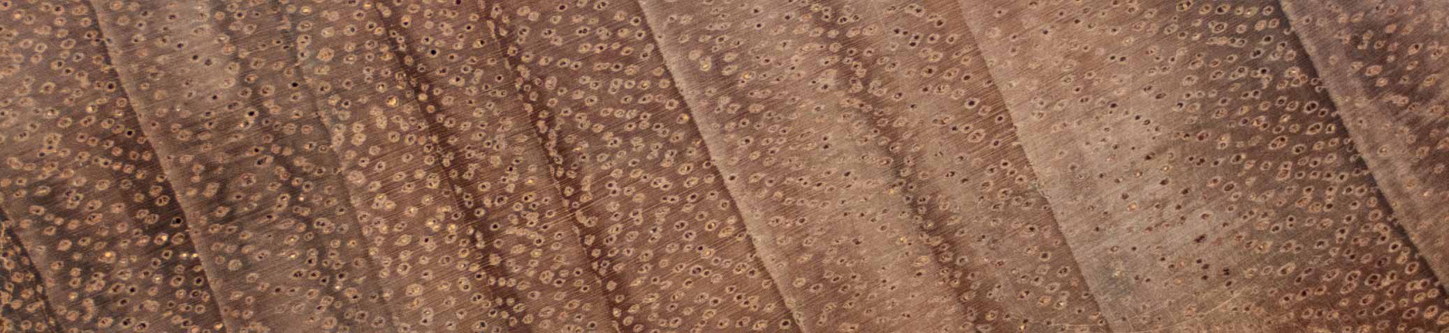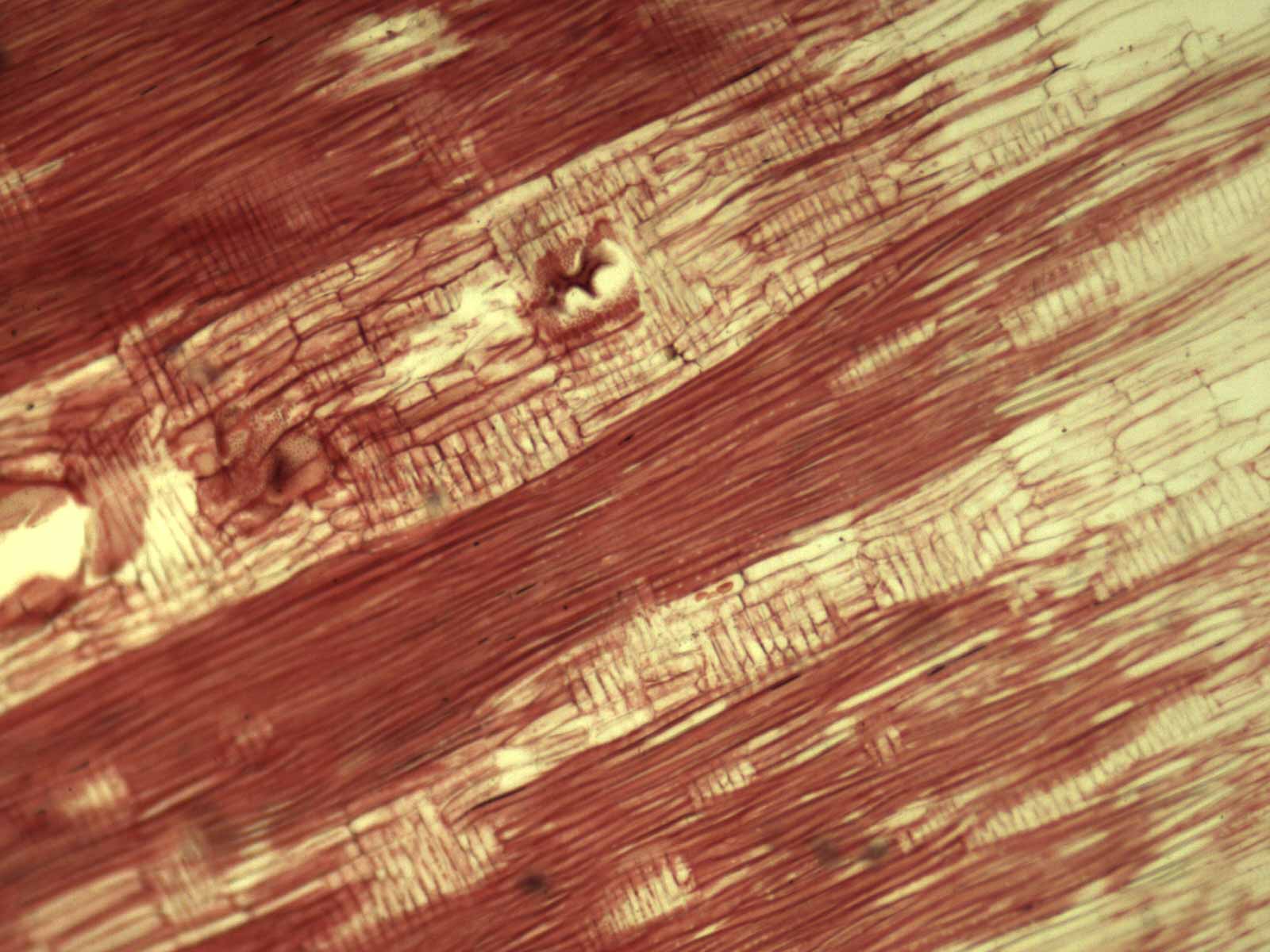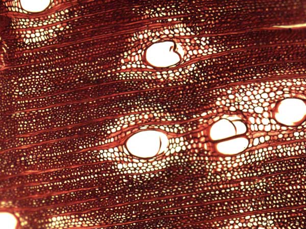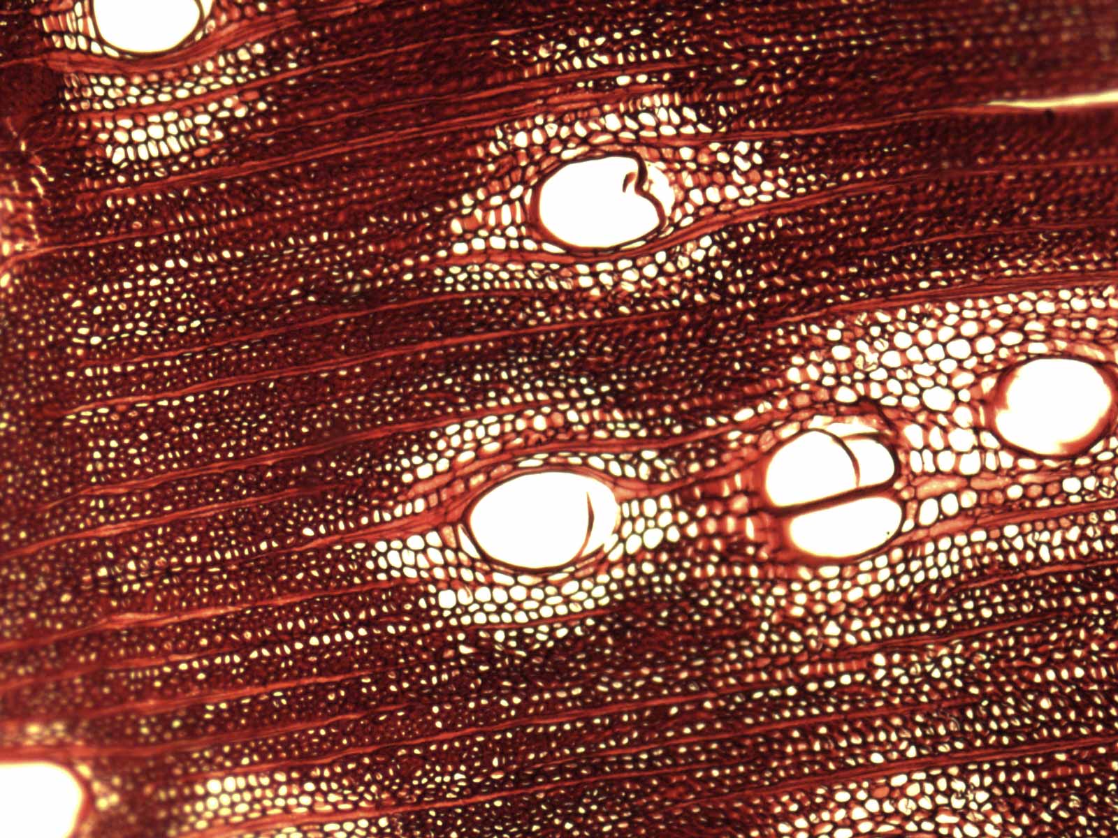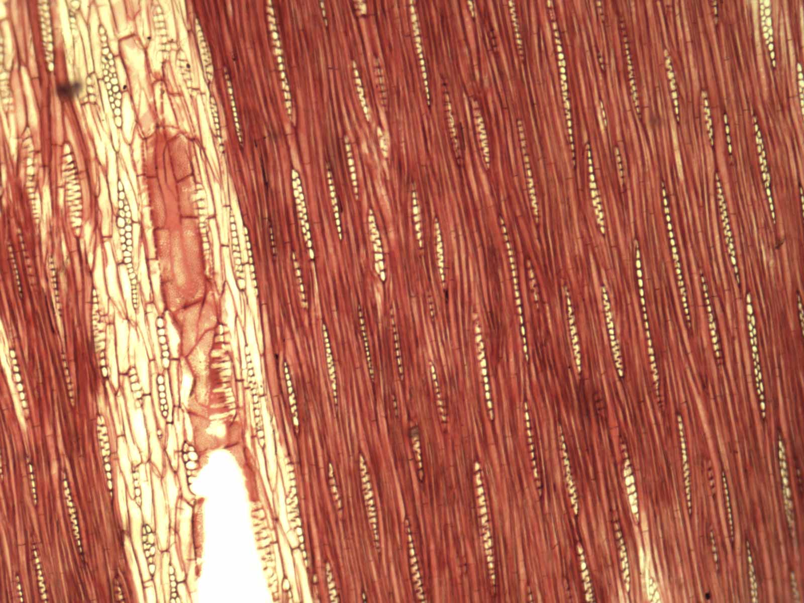 Anillos de crecimiento demarcados. Porosidad difusa, poros solitarios y múltiples de 2, sin disposición, muy grandes y poco numerosos, vacíos. Parénquima axial vasicéntrico con tendencia a aliforme, confluente y marginal, en series cortas. Radios 1-3 seriados, predominan los 2-seriados, en menor número los1 y 3 seriados, homogéneos. Estructura estratificada ausente. Fibras libriformes, de paredes delgadas.