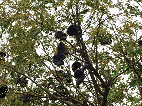 Hojas compuestas, bipinadas, alternas, de 30 cm de longitud, con 3-7 pares de pinas puestas de 5-9 cm longitud y compuestas de 8-23 pares de folíolos opuestos, sésiles, mucronados, con nervadura principal submarginal, de 5-25 mm de longitud y 2-6 mm ancho. Frutos negros, espiralados (de una sola espira), subleñosos, achatados, de 4-9 cm de largo por 5-7 cm ancho, pardo oscuro a negros, su forma recuerda a una “oreja” (de ahí el otro nombre vulgar “oreja de negro”).