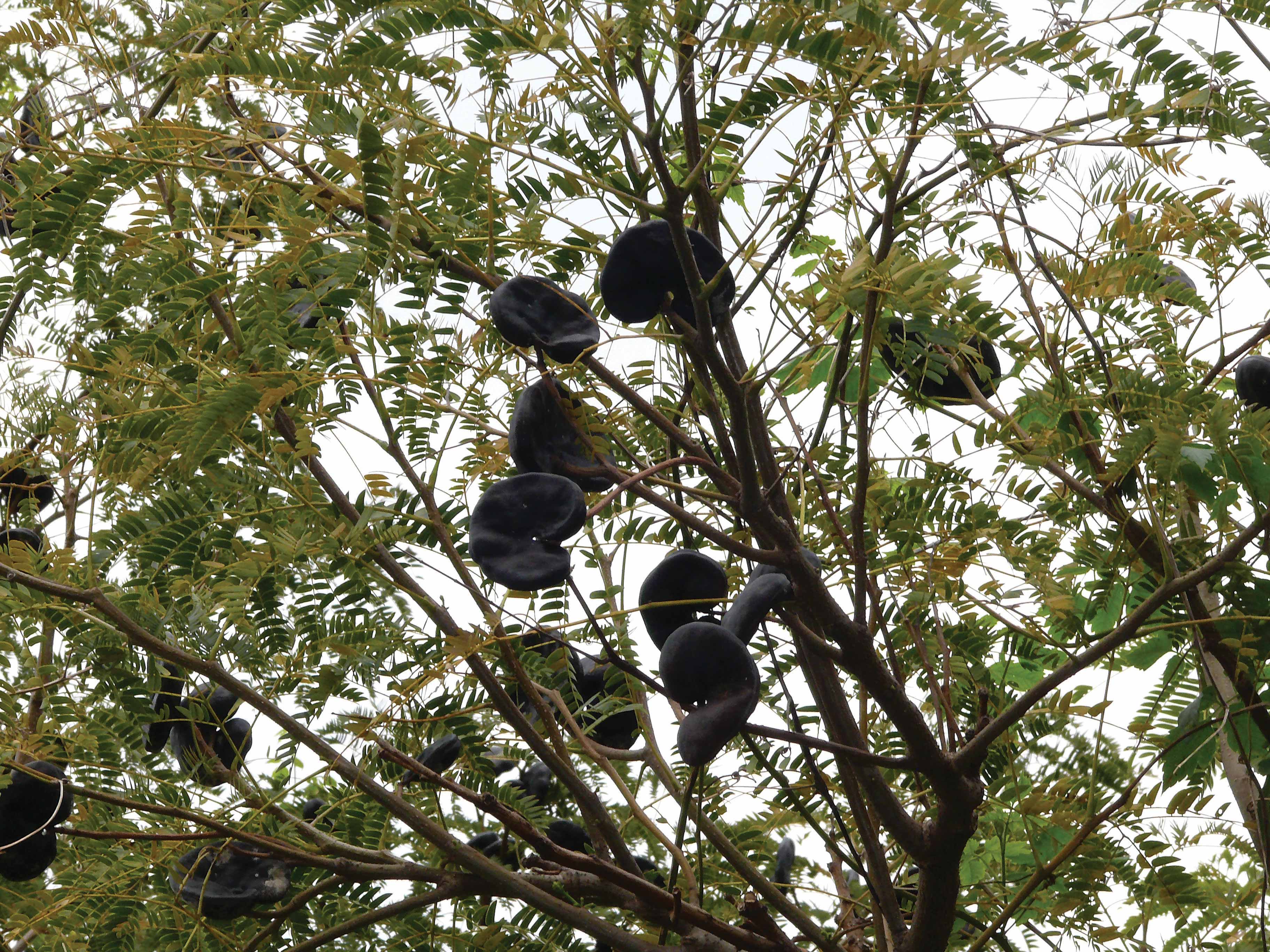 Timbó 6 | Enterolobium contortisiliquum. Hojas compuestas, bipinadas, alternas, de 30 cm de longitud, con 3-7 pares de pinas y 8-23 pares de folíolos opuestos, sésiles, mucronados, con nervadura principal submarginal. Frutos negros, espiralados (de una sola espira), subleñosos, achatados. Foto de Daniel Bazzano.