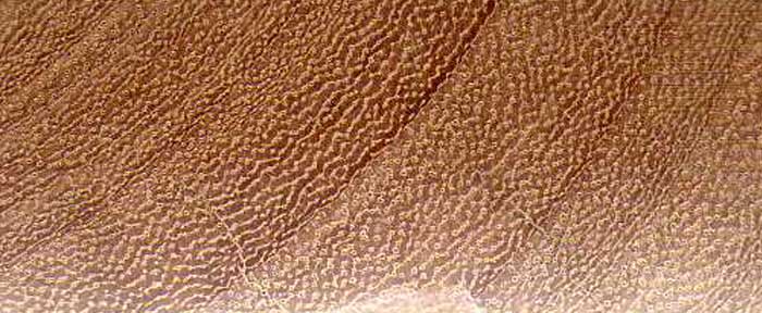 Madera de color blanco amarillento. Madera semipesada y semidura, de densidad aparente entre 0,670 a 0,750 g/cm3. Presenta textura gruesa y heterogénea, con grano oblicuo y diseño floreado, rayado.