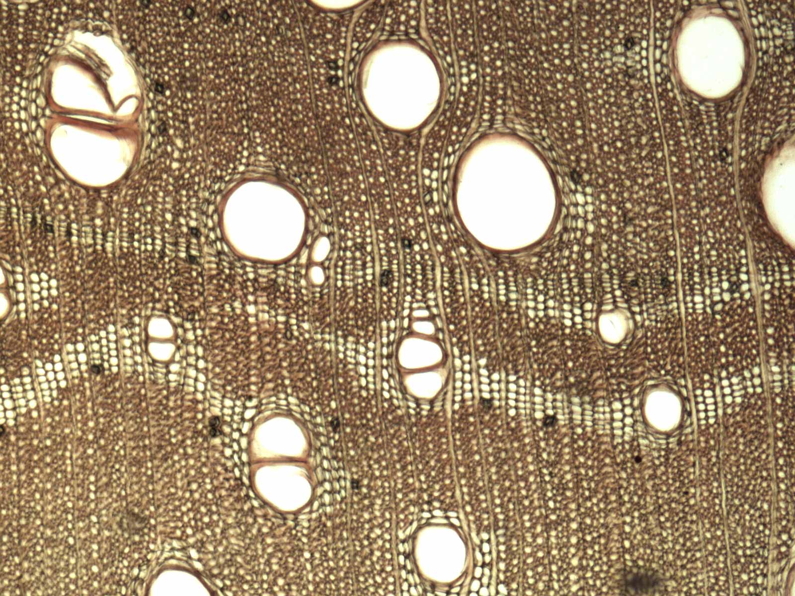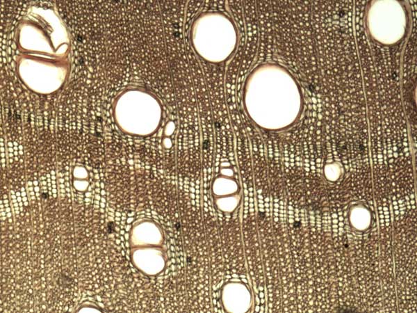 Los anillos de crecimiento son demarcados por la porosidad semicircular. Presencia de abundante parénquima confluente.