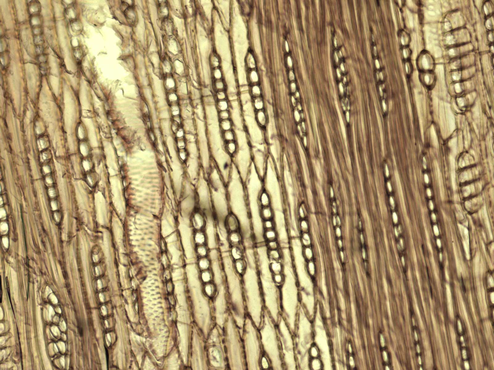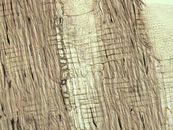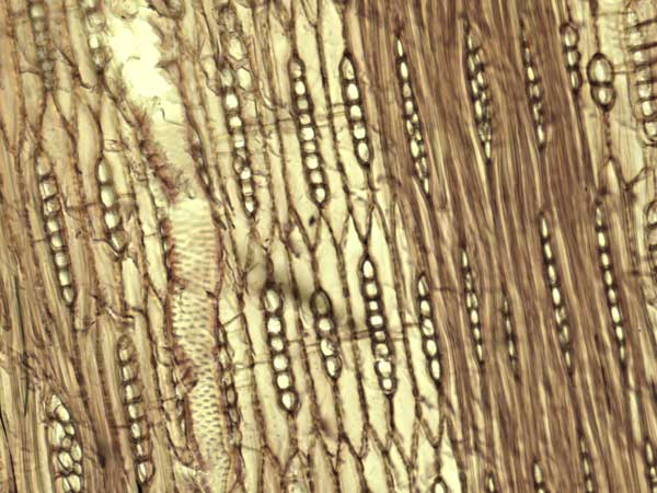 Los anillos de crecimiento demarcados. Porosidad semicircular. Poros solitarios y múltiples, vacíos, medianos y poco numerosos. Presencia de abundante parénquima confluente y en bandas angostas sobre todo en el leño tardío, marginal, en series de 2 células. Radios 1 seriados en su mayoría, raros 2-3 seriados, estratificados y homogéneos. Estructura estratificada completa. Fibras libriformes de paredes medias. Presencia de cristales en hileras verticales.